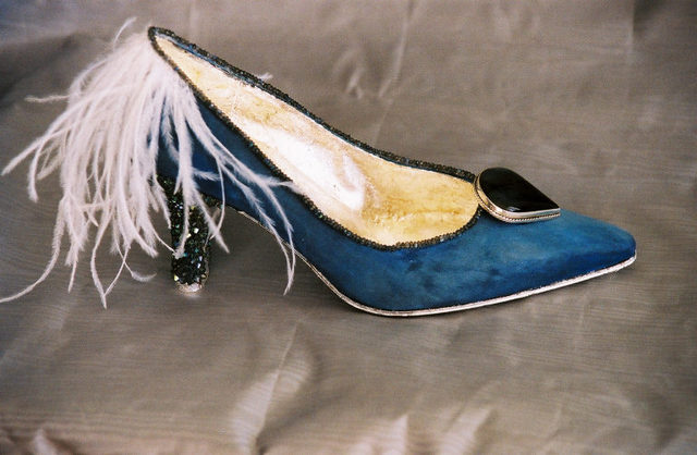 Designer Shoe Tribute to Ginger Rogers Rodger Scheibner, fashion designer of the House of Scheibner, has designed "Ginger", dedicated to Ginger Rogers and all women who have to dance backwards! This shoe is covered in deep blue fabric with moonstones and Austrian crystals adorning it. A large pear-shaped Spectralite sets off the toe and the delicate white ostrich feathers ring the heel. The interior of the shoe is a glistening metallic as is the sole of the shoe. The piece comes with its own plexiglass box, inscribed "Ginger". The shoe is signed. Proceeds from the sale of this one-of-a-kind shoe will help support youth programs sponsored by the Overlake Service League, a non-profit organization, in Bellevue, Washington. Your winning bid is tax deductible. For questions about the charity donation or more information contact Overlake Service League. This is OSL auction item number 20. Thank you for bidding. |